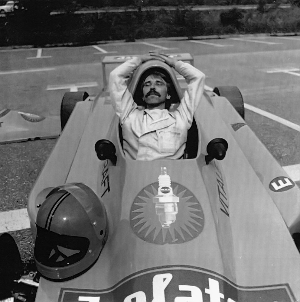 Peter Schwalbe sitzt in seinem Rennwagen und genießt die Sonne, konzentriert sich aber auch auf das Rennen.