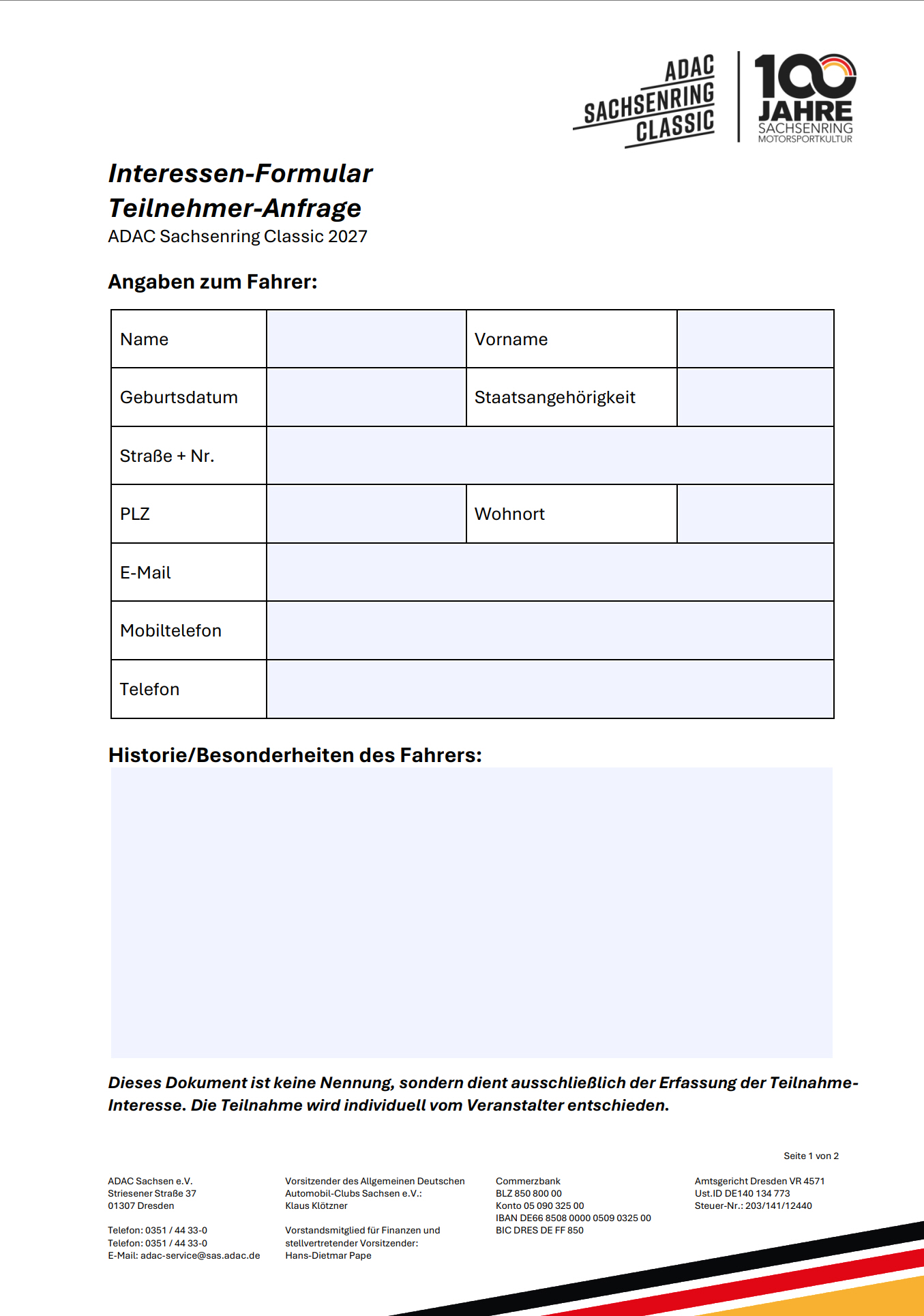 Nach Eingang Ihrer Interessenbekundung erhalten Sie Mitte dieses Jahres von uns ein persönliches, digitales Nennformular, das speziell für Ihre Epoche bzw. Fahrzeugzuordnung erstellt wird. Erst die vollständig ausgefüllte und fristgerecht eingereichte Nennung, verbunden mit der Zahlung eines moderat gehaltenen Nenngeldes, gilt als offizielle und verbindliche Nennung zur Veranstaltung.
