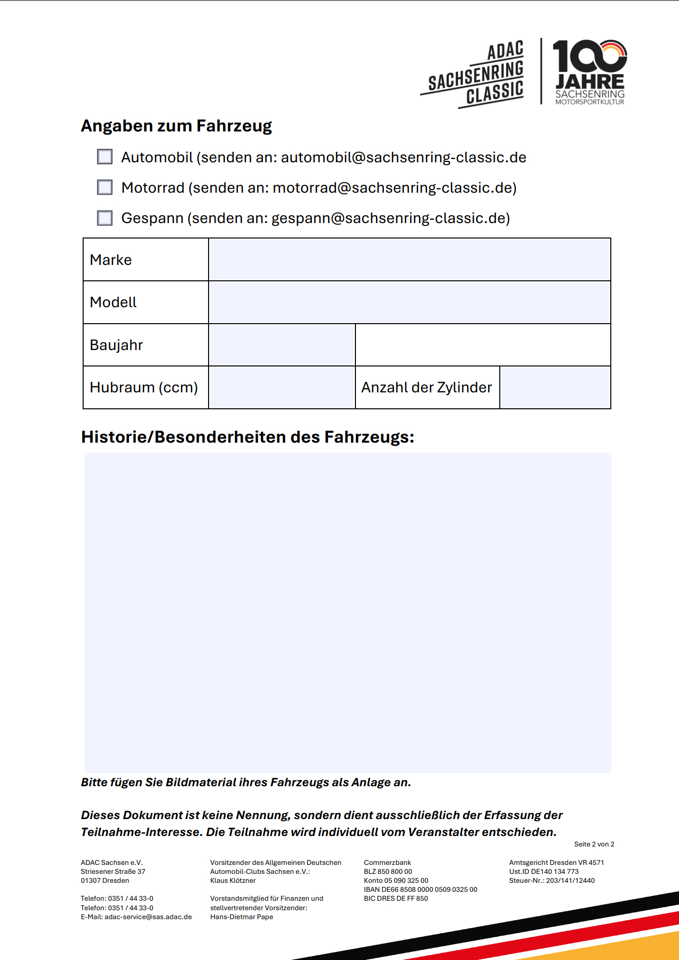 Wie oben beschrieben, ist hier das Interessen-Formular ADAC Sachsen e.V. frei gegeben. Dieses sollte schnellstmöglich - aussagefähig ausgefüllt - mit Bildmaterial für die Automobile an die E-Mail-Adresse